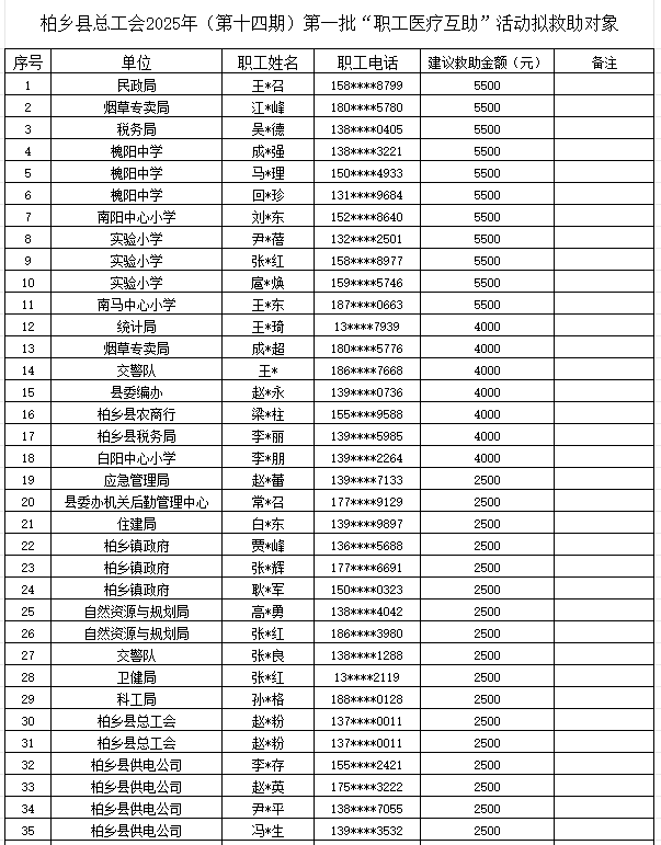 根据柏乡县总工会《关于开展第十四期“职工医疗互助”活动的通知》(柏工字﹝2025﹞3号)文件,为使救助工作做到公开、公平、公正,进一步提高工会职工医疗互助工作透明度,拟确定66名职工为2025年度第一批救助对象。现将名单予以公示,接受广大职工群众监督,如有情况不实,可通过电话、面谈等形式反映,我们将认真受理,并及时将调查结果进行反馈。