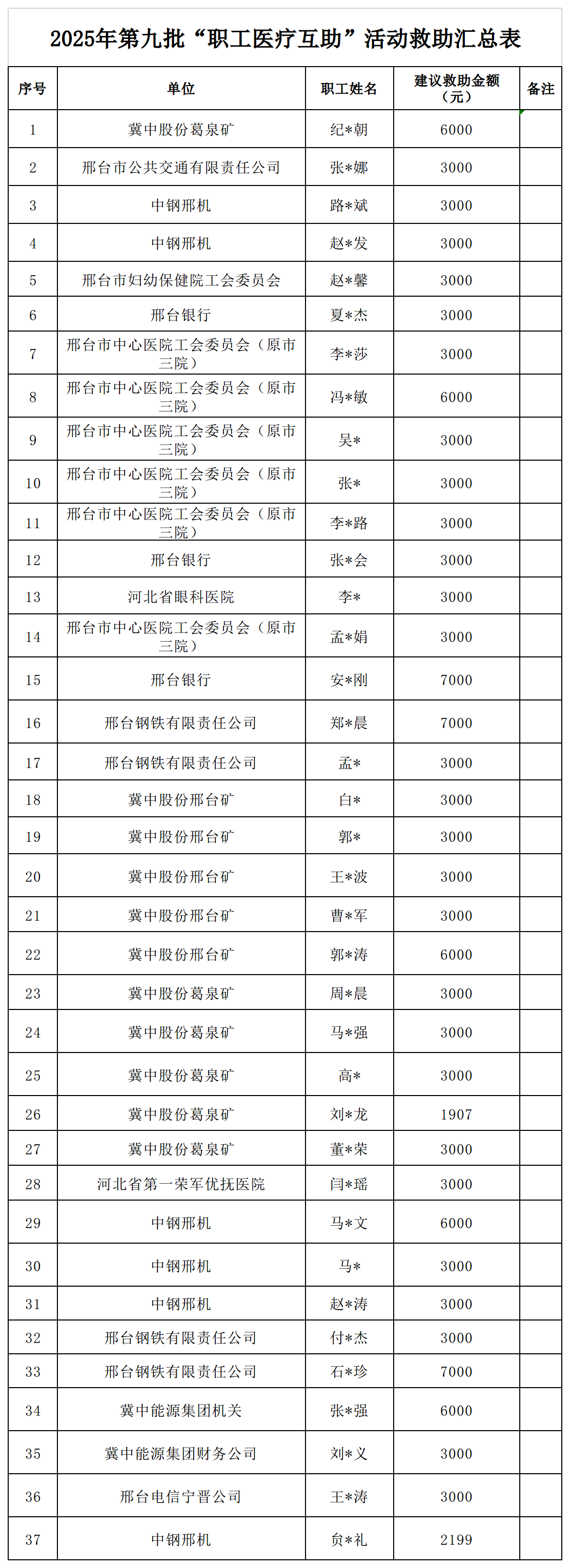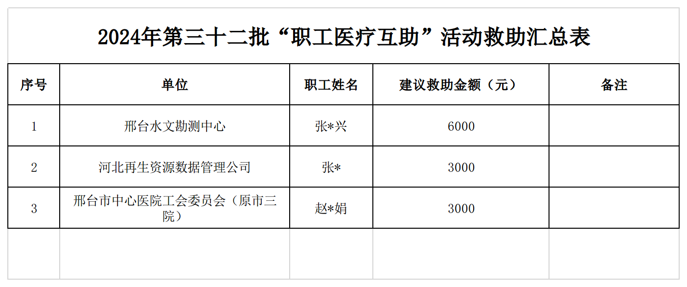 根据邢台市总工会对口单位工会“职工医疗互助”活动实施细则规定,现对本批次医疗互助救助情况进行五个工作日公示,如对公示内容有异议,请将意见反映到市总工会职工服务中心。电话:3190877