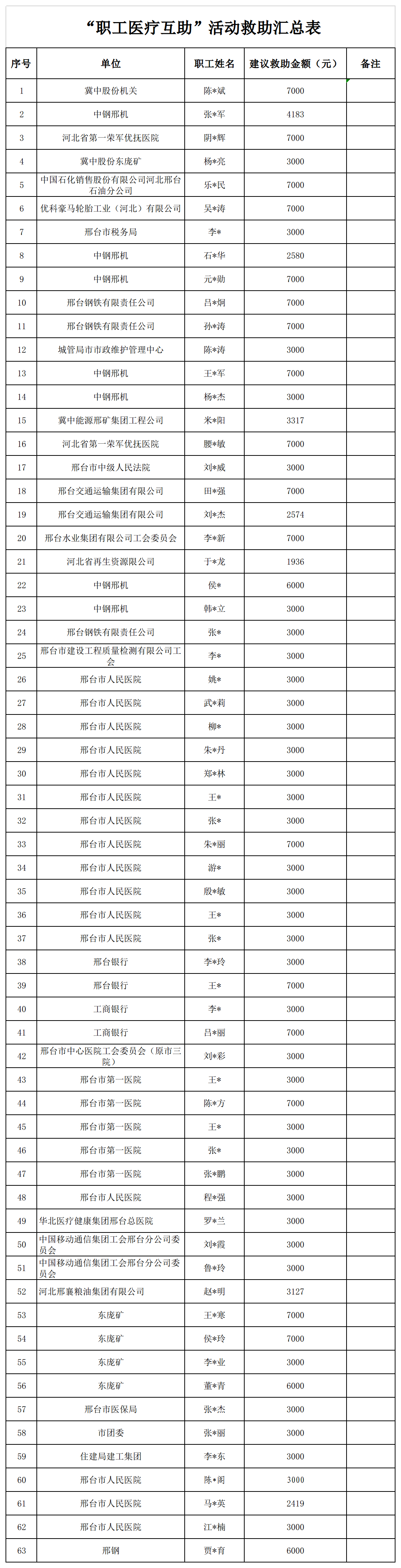 根据邢台市总工会对口单位工会“职工医疗互助”活动实施细则规定,现对本批次医疗互助救助情况进行五个工作日公示,如对公示内容有异议,请将意见反映到市总工会职工服务中心。电话:3190877